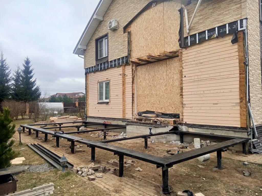 —Фундамент для будущей веранды-оранжереи из 15 винтовых свай и двух швеллеров под стены из бревна